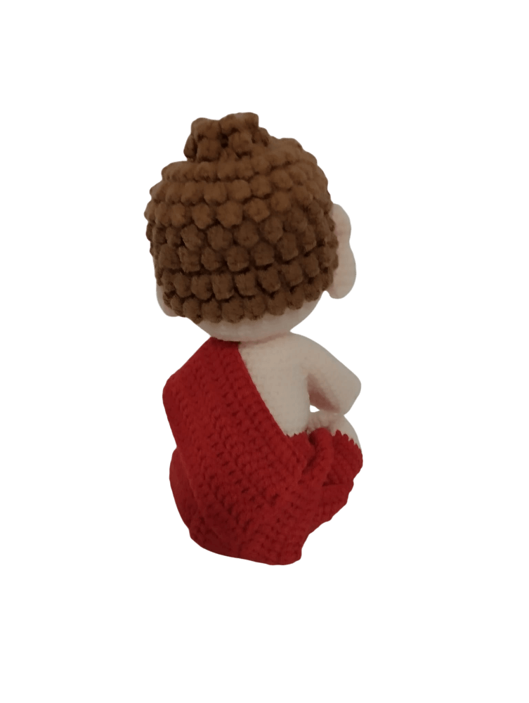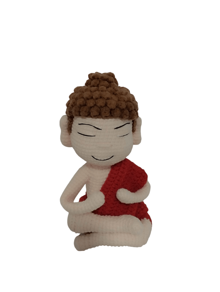 Este adorable Buda amigurumi está tejido completamente a mano con mimo y atención al detalle. Sentado en postura de meditación y envuelto en su túnica roja, transmite una sensación de paz y armonía que lo convierte en una pieza perfecta para decorar cualquier rincón especial. Su expresión serena, con ojos suavemente cerrados y una sonrisa tranquila, invita a la calma y al bienestar. El cabello está elaborado con una textura esponjosa que le da un acabado encantador y artesanal.