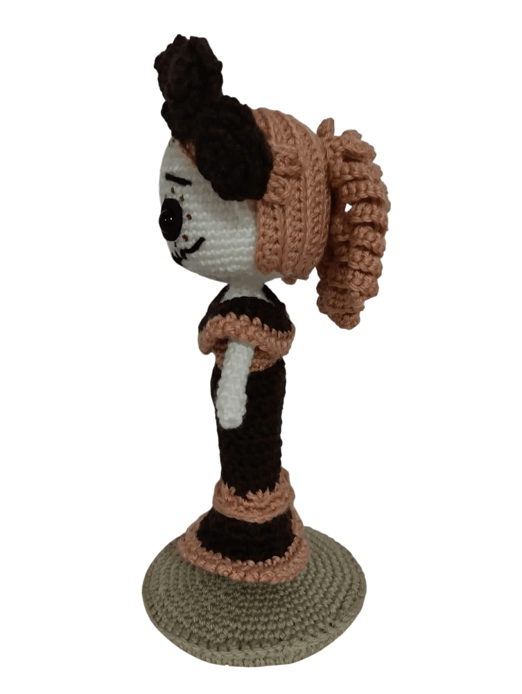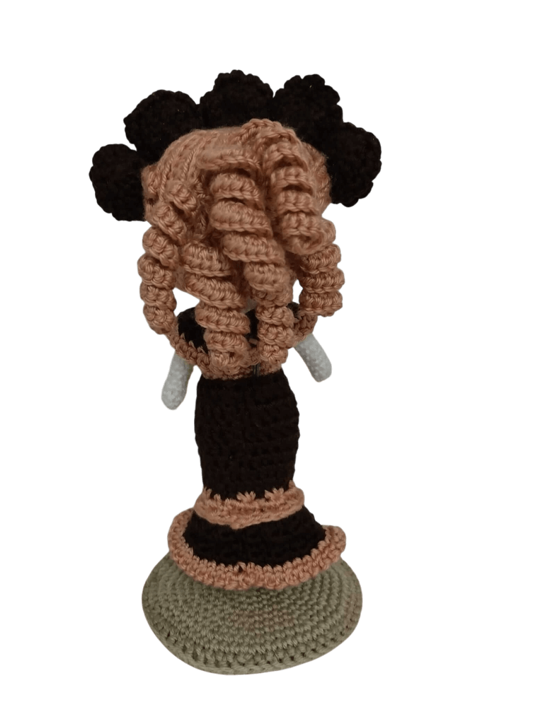 Esta encantadora Catrina amigurumi, es una pieza única tejida a mano con amor y dedicación. Su vestido en tonos marrón oscuro y marrón claro resalta su elegancia, mientras que su corona de rosas tejidas le da un aire sofisticado y tradicional. Tiene ojos de seguridad que le dan una mirada profunda y expresiva. Los detalles pintados con pintura acrílica en su rostro, reflejan el arte del maquillaje tradicional de Catrinas. Su vestido largo con delicados detalles en contraste, realzan su porte distinguido. Mide 19 cm de alto y es ideal para coleccionistas, amantes del folklore mexicano o como un regalo especial que honre las tradiciones. ¡Llévate a casa esta catrina única y dale un toque mágico a tu espacio!