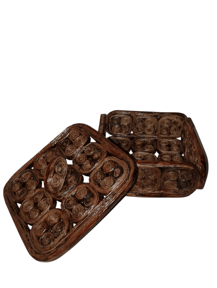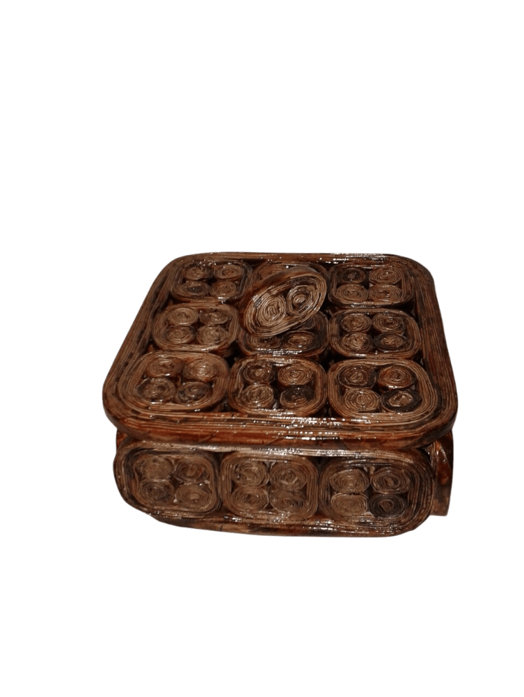 Esta hermosa caja con tapa es una verdadera obra de arte hecha a mano. Elaborada a partir de papel de periódico reciclado y barnizada para una mayor resistencia, combina la creatividad con la sostenibilidad, ofreciendo una alternativa ecológica y única para almacenar lo que desees. Con un diseño detallado y cuidadosamente trabajado, su estructura es sorprendentemente firme y duradera. Es ideal para guardar joyas, accesorios, recuerdos especiales o cualquier otro objeto pequeño. Además, su acabado barnizado le otorga un brillo elegante y una textura suave al tacto. Con sus 7 cm de alto y 15.5 cm de ancho/largo es perfecta como regalo especial o para darle un toque artesanal a tu hogar. Hecha con amor y con materiales reciclados, ayudando al planeta.