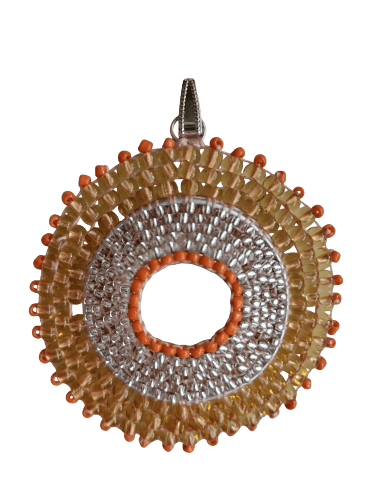 Este hermoso colgante está elaborado con cuentas en tonos dorado, plateado y naranja, tejidas a mano con delicadeza y precisión para crear un diseño circular vibrante y elegante. Su estructura ligera y su combinación de colores cálidos aportan un toque bohemio y sofisticado a cualquier atuendo. Perfecto para quienes aman la joyería artesanal y desean llevar consigo una pieza única llena de encanto y personalidad. Ideal para regalar o complementar tu estilo con un accesorio especial. Con su centro de cristal y sus 6 cm prefecto para darle un toque de originalidad a tu look con este colgante exclusivo.