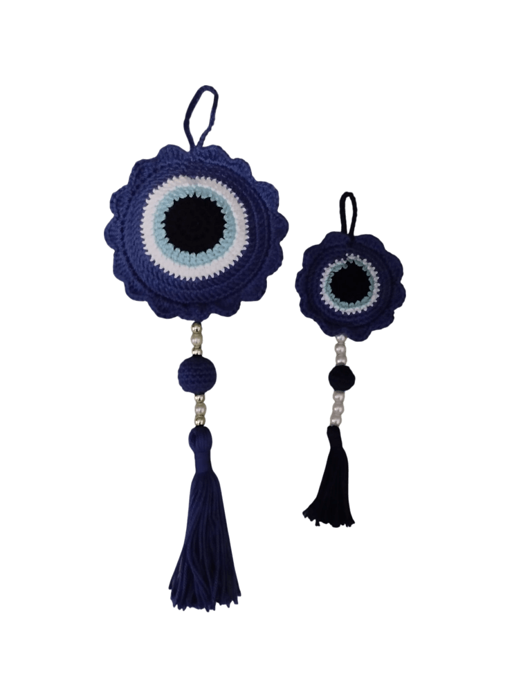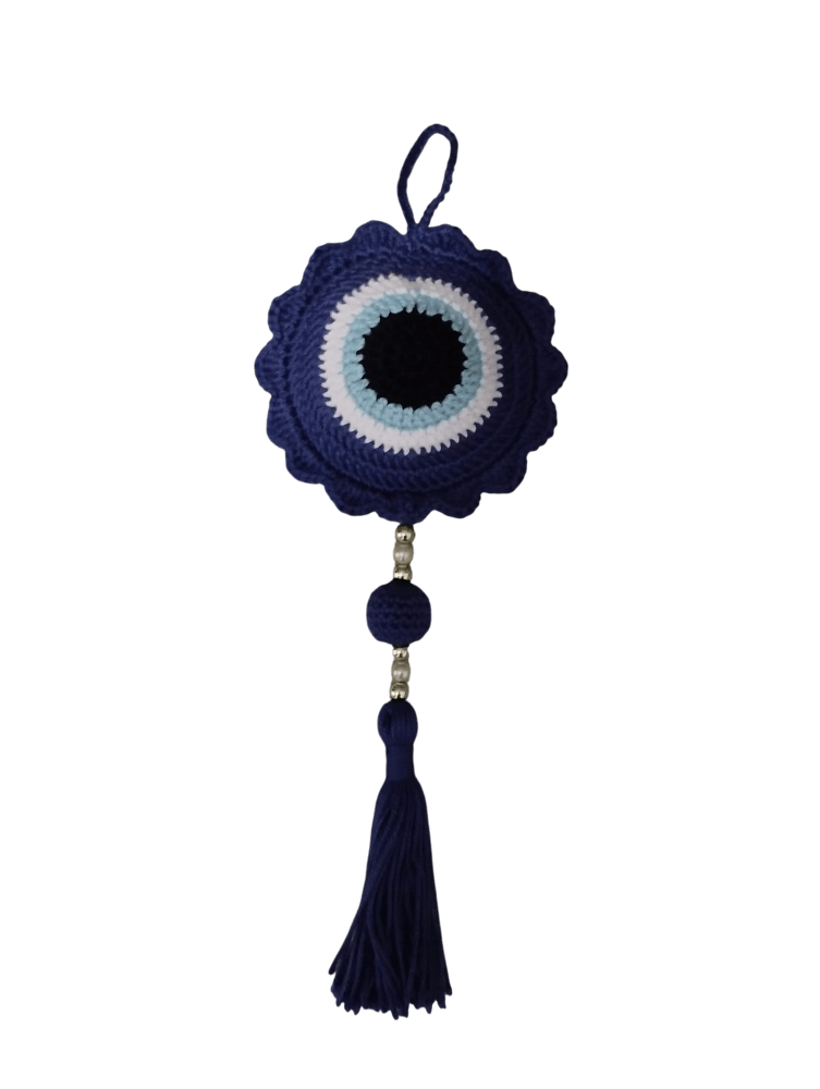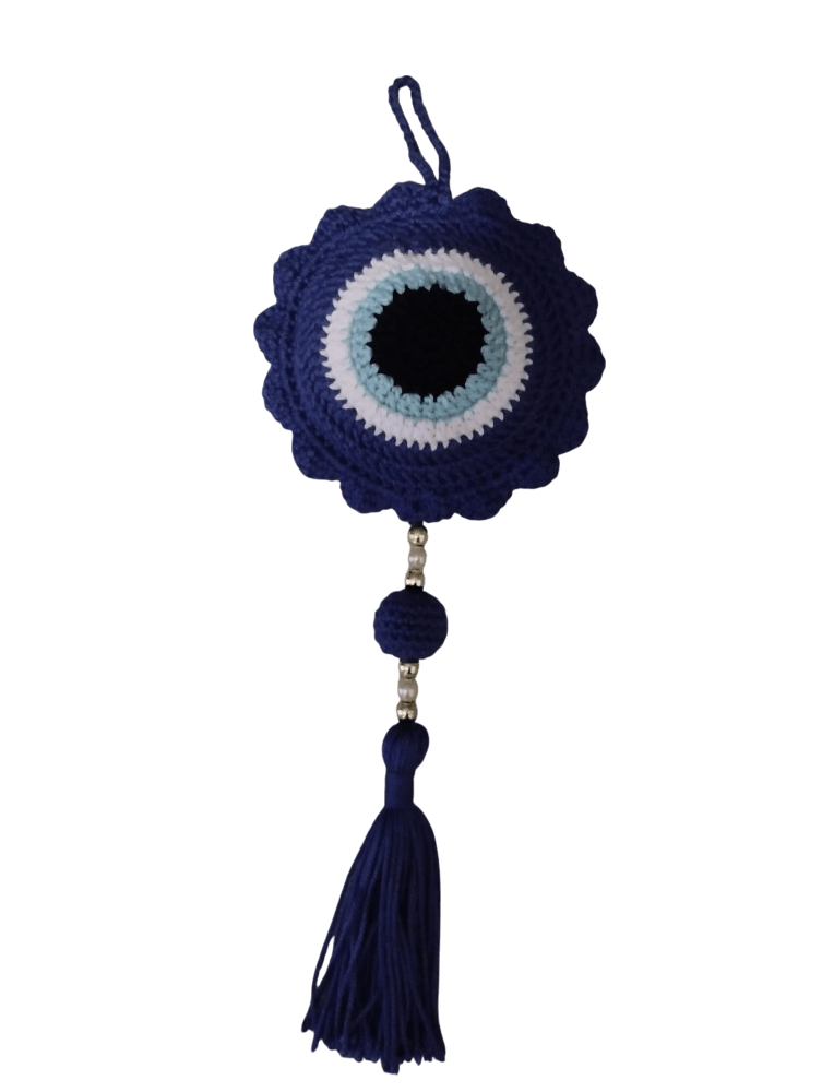 Colgante de protección y estilo en un solo detalle. Dale un toque especial a tu hogar, oficina o automóvil con este hermoso colgador artesanal tejido completamente a mano con la técnica de amigurumi. Su diseño en forma de ojo turco, símbolo de protección y buena energía, combina detalles decorativos como cuentas y una elegante borla tejida, lo que lo convierte en un accesorio único y lleno de encanto. Mide 12 cm de diámetro y 34 cm de largo, lo que lo hace ideal para colgar en puertas, paredes, ventanas o incluso en tu coche. Cada pieza es única, elaborada con dedicación y amor, perfecta para regalar o para llenar tu espacio de energía positiva y artesanía con alma.
