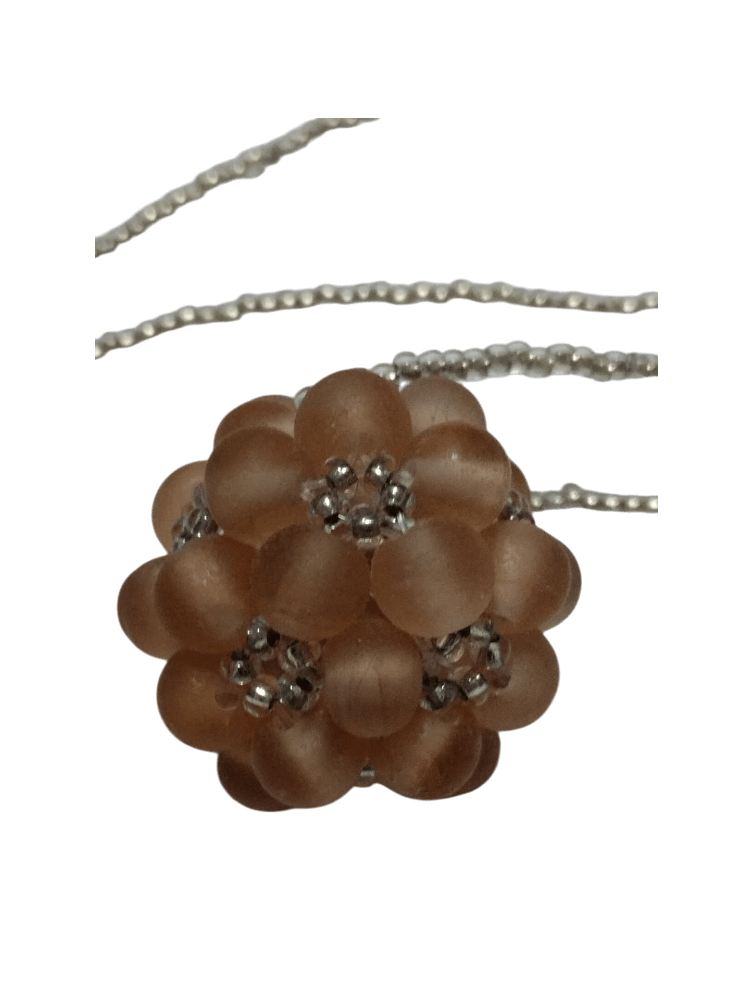Este delicado collar artesanal de 40 cm combina la sutileza y el encanto de lo hecho a mano. Su cadena de finas cuentas plateadas resalta con elegancia, mientras que en el centro brilla una esfera tejida con cuentas en tonos rosa y plata, formando un diseño armonioso y sofisticado. Cada detalle ha sido cuidadosamente elaborado para ofrecer una pieza única y especial, perfecta para realzar cualquier look con un toque de dulzura y distinción.