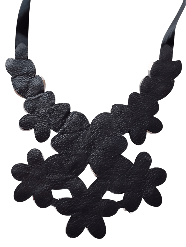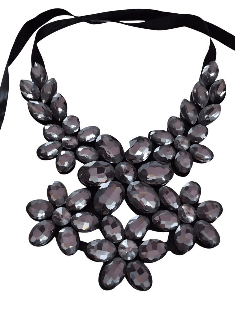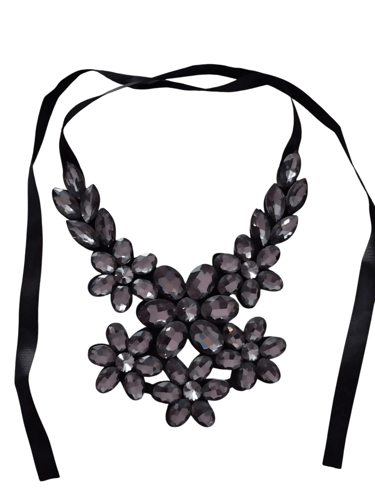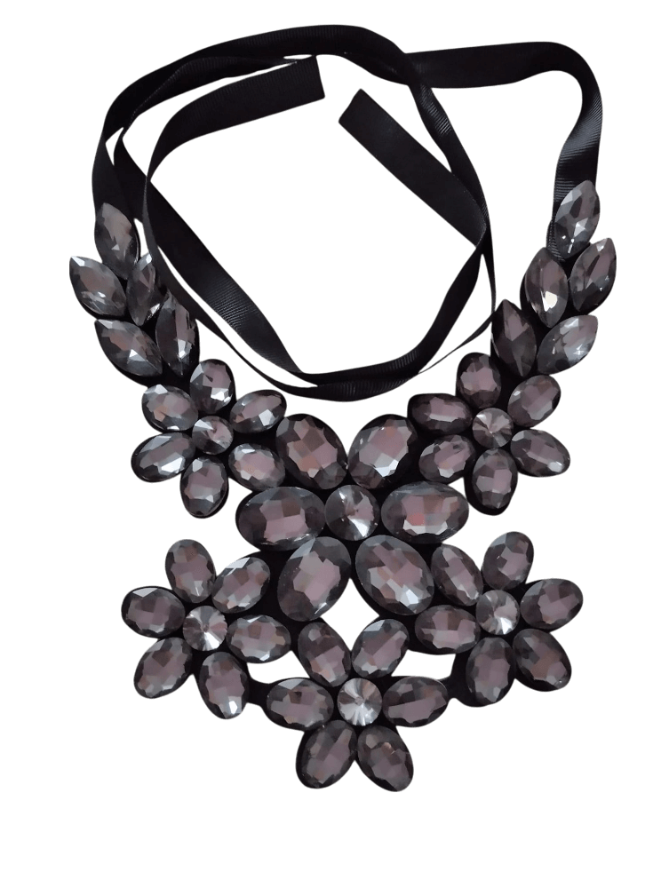 Este deslumbrante collar-gargantilla es una pieza de bisutería que destaca por su elegancia y sofisticación. Elaborada con cristales facetados de tono gris humo, cuidadosamente dispuestos en forma de flores y racimos, cada piedra refleja la luz con un brillo sutil y encantador. Los cristales están montados sobre una base de cuero negro suave, que añade un contraste moderno y refinado a su diseño. Con una medida de 16 cm de ancho por 18 cm de alto (solo la parte decorada), esta gargantilla es ideal para realzar cualquier escote, aportando un toque de glamour a tu look. Se ajusta al cuello mediante una cinta negra, permitiendo un amarre cómodo y versátil. Perfecta para eventos especiales o para elevar un outfit casual con un toque de brillo, esta pieza es sin duda una declaración de estilo.