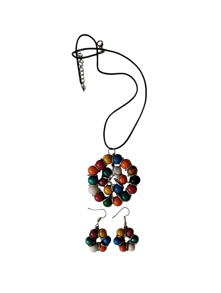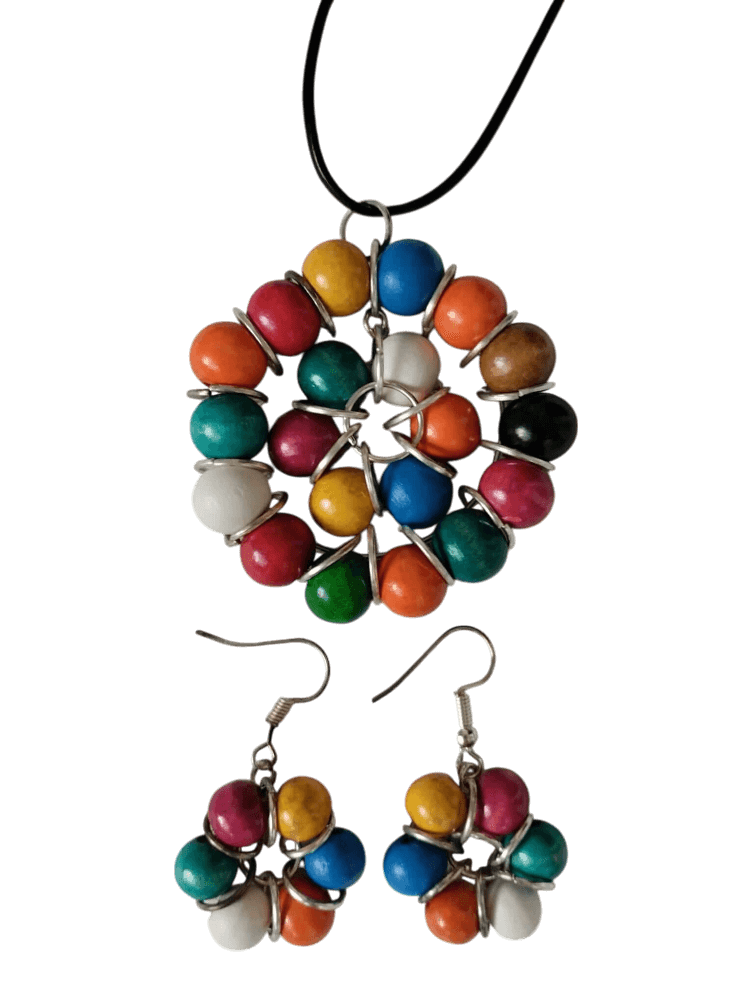 Conjunto Arcoíris Artesanal – 22 cm. Llena tu look de color y alegría con este hermoso conjunto de bisutería hecho a mano. Con cuentas de madera vibrantes y un diseño en espiral armonioso, este collar y sus aretes reflejan la energía y calidez de la artesanía. Elaborado con materiales naturales y cuidadosamente entrelazado con alambre, cada pieza es única y está pensada para resaltar tu estilo con un toque bohemio y original. Su diseño versátil lo convierte en el accesorio ideal para cualquier ocasión, aportando un aire fresco y divertido a tu outfit. Perfecto para quienes aman la joyería artesanal llena de color y personalidad.