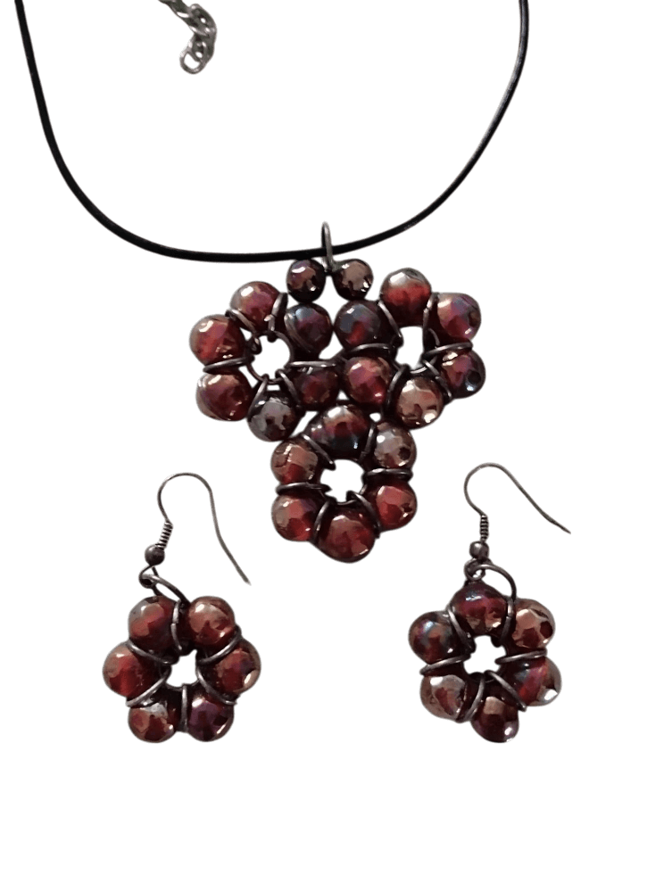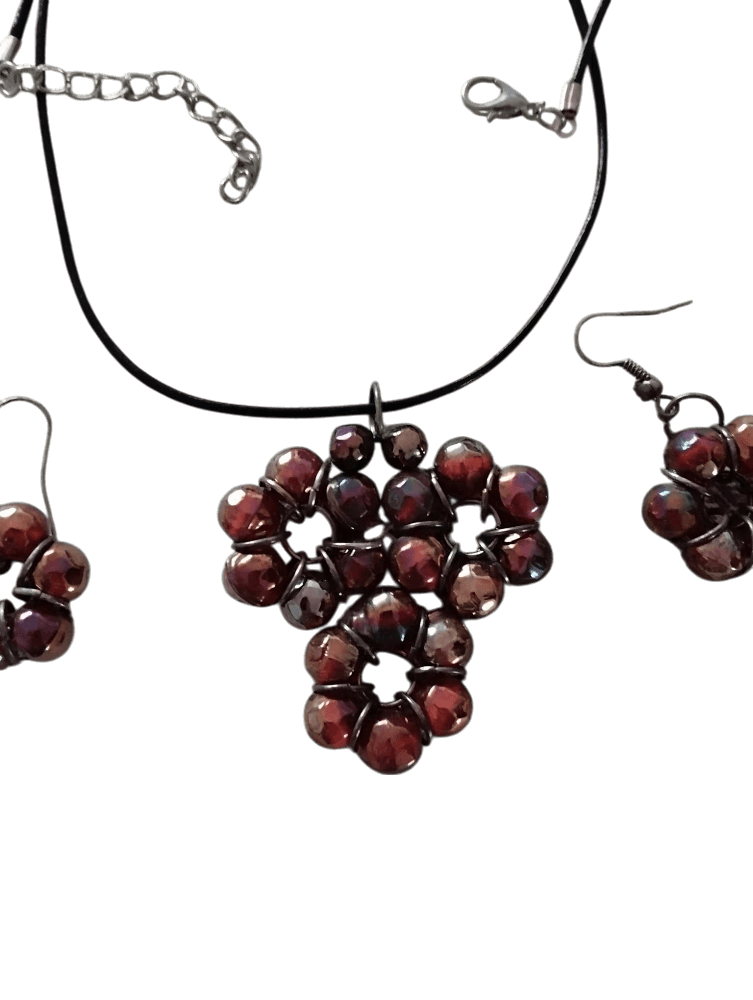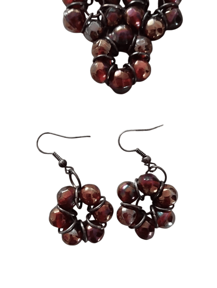 Este elegante conjunto de bisutería, hecho completamente a mano, está compuesto por un collar y un par de aretes que destacan por su brillo y delicadeza. Las piezas están elaboradas con cuentas de cristal en tonos burdeos y púrpura oscuro, ensambladas con técnica de tejido en alambre negro, formando motivos florales que capturan la luz con cada movimiento. El collar incluye una cadena de extensión plateada que permite ajustar el largo a tu preferencia, mientras que los aretes tipo gancho ofrecen comodidad y ligereza, ideales para llevar todo el día. Una joya perfecta para ocasiones especiales o para agregar un toque de distinción a tu look diario, este conjunto combina artesanía con un acabado sofisticado y lleno de personalidad.