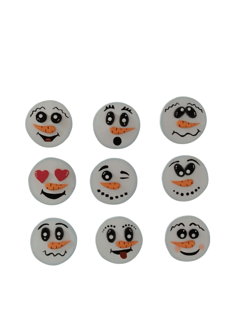 ¡Lleva la magia del invierno a tu hogar con esta encantadora colección de imanes de muñecos de nieve! Hechos y pintados a mano con detalle y ternura, estos imanes presentan adorables caras de muñecos de nieve con divertidos gestos y narices naranjas que les dan un toque único. Cada imán tiene un diámetro de 5 cm, lo que los convierte en piezas perfectas para decorar tu nevera o cualquier superficie metálica. Con su diseño alegre y simpático, esta colección es ideal para darle un toque navideño y fresco a tu espacio, además de ser un detalle perfecto para regalar.