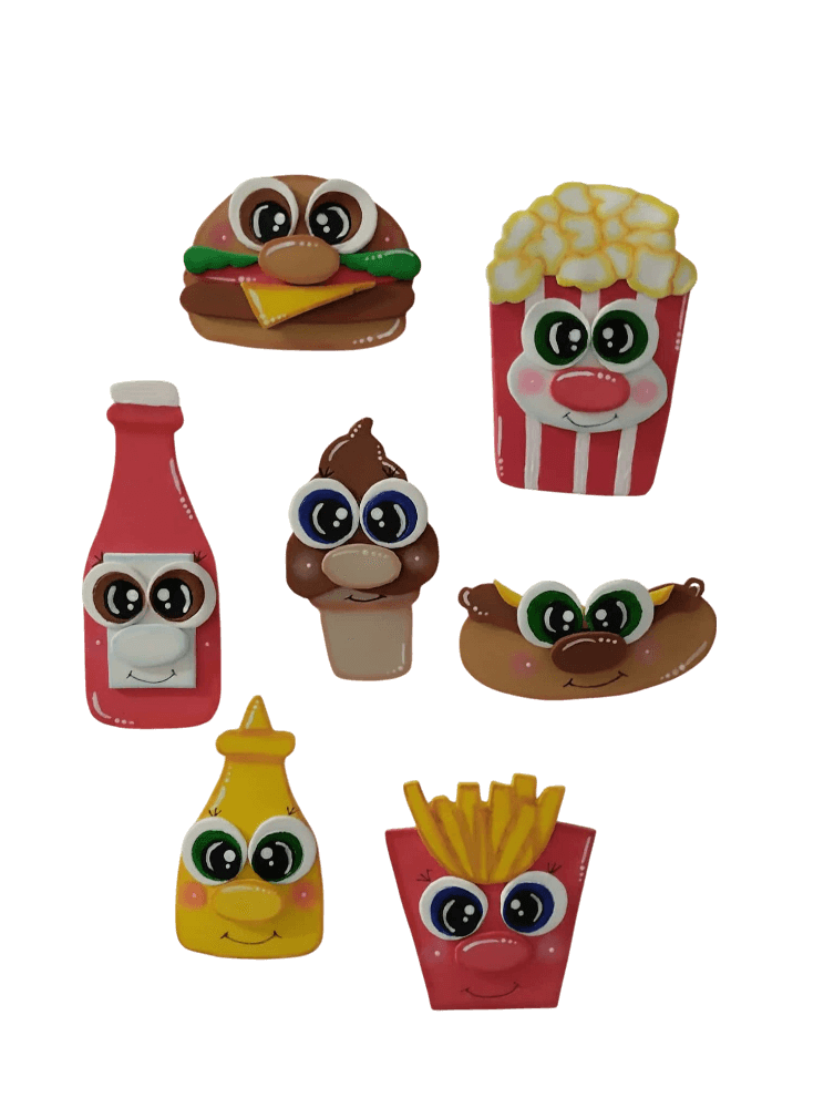 Con estos bonitos Imanes puedes darle un toque divertido y colorido a tu cocina o cualquier espacio.  Esta encantadora colección está hecha y pintada a mano, están elaborados con goma E.V.A. y pintura acrílica. Esta colección  incluye 7 diseños únicos inspirados en los antojos clásicos de un domingo: hamburguesa (5×7 cm), hot dog (3,5×8 cm), papas fritas (7×7 cm), palomitas (9,5×6,5 cm), helado (8×5 cm), kétchup (10,5×4,5 cm), mostaza (8×4,5 cm), todos con expresiones adorables y llenos de personalidad. Perfectos para decorar o regalar.