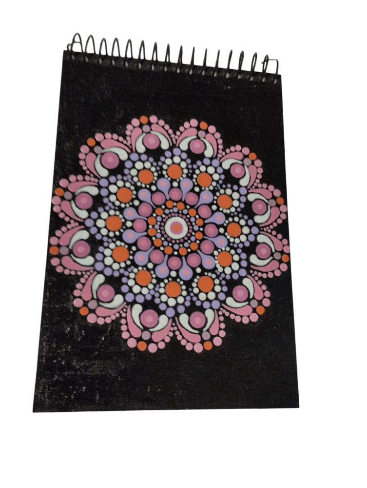 Libreta artesanal decorada con un delicado mandala pintado a mano, una pieza única que combina creatividad y funcionalidad. Su portada, en tono oscuro, resalta un hermoso diseño de mandala realizado con la técnica de puntillismo, donde cada pequeño punto está cuidadosamente aplicado para formar un patrón armonioso y equilibrado en colores suaves como rosa, lila, blanco y toques de naranja.