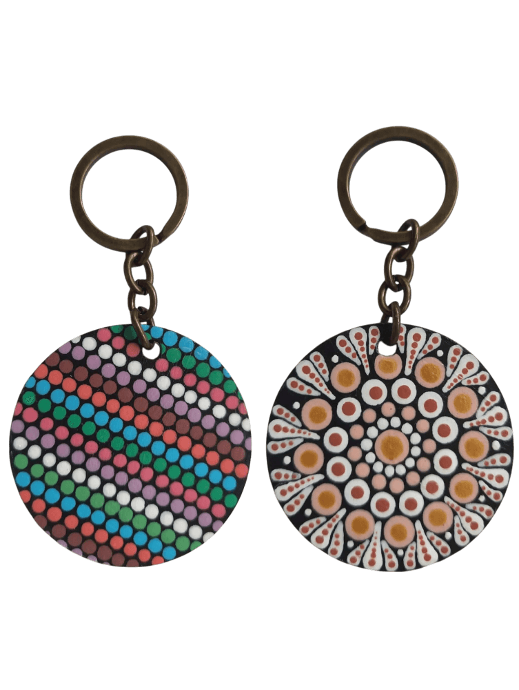 Bonito llavero Mándala realizado con la técnica del puntillismo, pintado a mano e intencionado  con el Código Sagrado de Agesta. Es una pieza única e irrepetible, su forma y su colorido se va inventando al ir lo pintando. Lleva contigo un símbolo de armonía y protección de 5 cm de diámetro y una pintura acrílica resistente. Ideal para los amantes de lo artesanal, lo hecho a mano y los único.