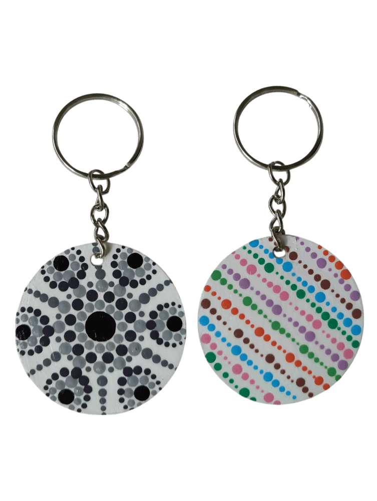 Bonito llavero Mándala realizado con la técnica del puntillismo, pintado a mano e intencionado  con el Código Sagrado de Agesta. Es una pieza única e irrepetible, su forma y su colorido se va inventando al ir lo pintando. Lleva contigo un símbolo de armonía y protección de 5 cm de diámetro y una pintura acrílica resistente. Ideal para los amantes de lo artesanal, lo hecho a mano y los único.