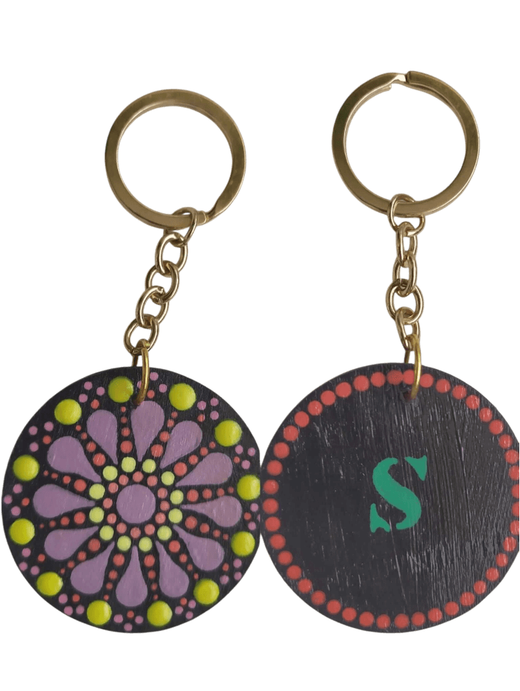 Este encantador llavero artesanal, de 5 cm de diámetro, está elaborado en madera y pintado a mano con esmero. Presenta de un lado un mándala colorido en tonos lilas, amarillos y rojos, creado con la técnica de puntillismo para transmitir alegría y vitalidad. En el reverso, luce una inicial personalizada en color verde, rodeada de un delicado marco de puntos rojos que resaltan sobre el fondo negro. Equipado con una anilla metálica dorada de alta calidad, es ideal para tus llaves, bolso o mochila. Cada pieza es única, pensada para regalar o llevar contigo un detalle lleno de arte, color y personalidad.