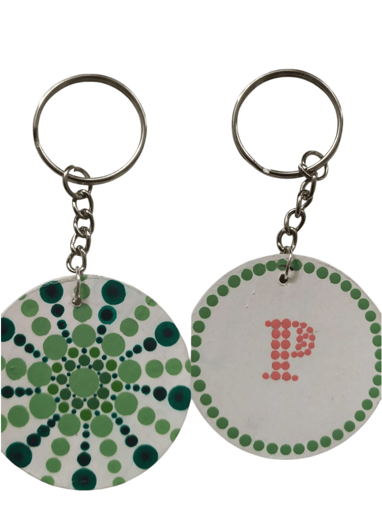 Llavero Doble Diseño – Mándala & Letra P. Dale un toque especial a tus llaves con este llavero artesanal de madera pintado a mano con la técnica de puntillismo. Con un diámetro de 5 cm, su diseño de mándala en tonos verdes transmite equilibrio y serenidad, mientras que en el reverso lleva una inicial personalizable, rodeada de un sutil detalle en puntillismo. Su estilo boho, artístico y exclusivo lo convierte en un regalo ideal para quienes aman lo artesanal y los detalles únicos. Cada pieza es hecha con amor y completamente única.