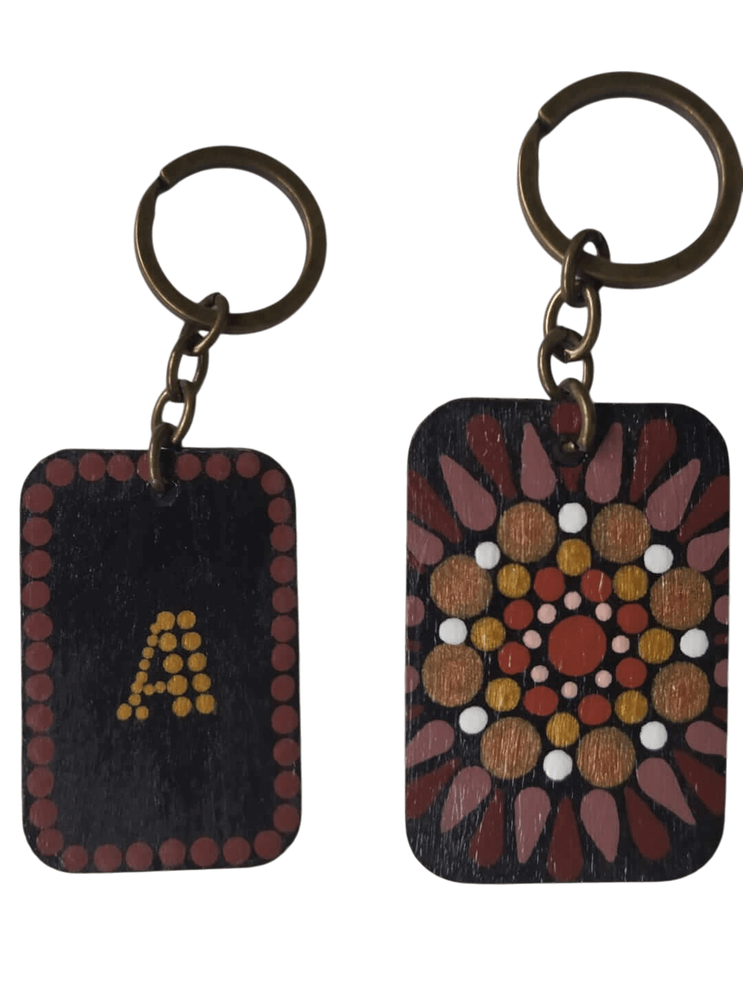 Llavero Doble Diseño – Mándala & Letra A. Dale un toque único y especial a tus llaves con este hermoso llavero artesanal de madera pintado a mano con la técnica de puntillismo. Su diseño doble cara presenta, por un lado, una elegante inicial personalizable, y por el otro, un mándala en tonos cálidos que transmite armonía y equilibrio. Con un tamaño de 5 x 3.5 cm, es ligero y práctico, ideal para llevar en tus llaves, bolso o mochila. Su acabado boho y artesanal lo convierte en un regalo perfecto y exclusivo para cualquier ocasión. Cada pieza es única y hecha con amor.