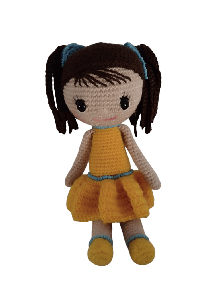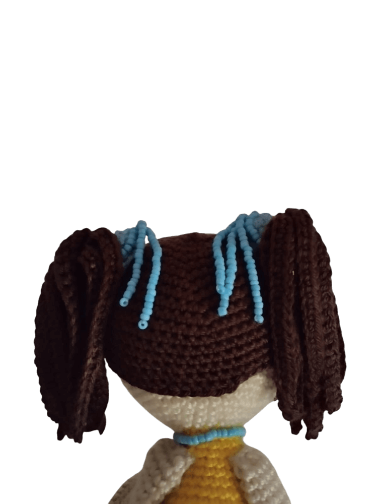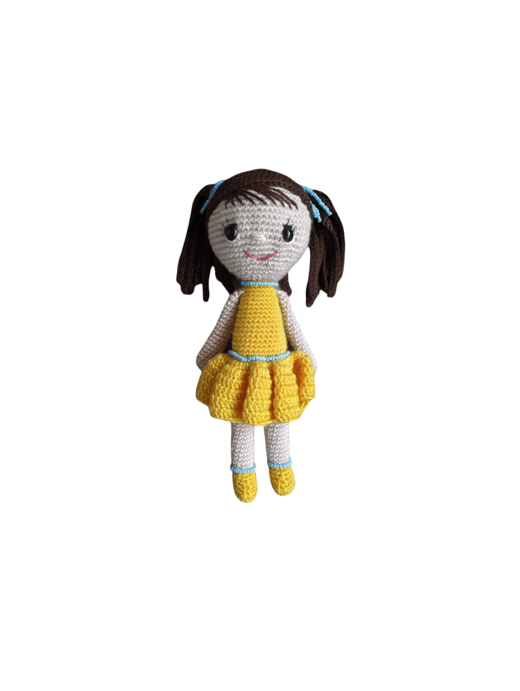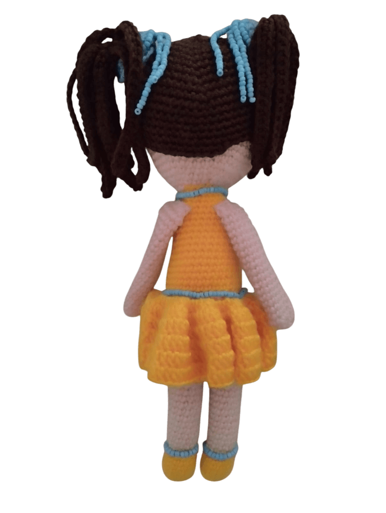Esta muñeca morenita es un puro encanto, su cabello largo recogido en dos coletas alegres, adornadas con delicadas cuentas azules que le dan un toque juguetón. Su mirada brillante y su sonrisa suave la hacen ver traviesa y tierna a la vez, como si siempre estuviera a punto de contar un secreto o hacer una travesura simpática. Su vestido amarillo es radiante, con una faldita de vuelo que parece lista para dar giros divertidos. El cinturón de cuentas y los detalles en los bordes de sus zapatitos completan su look, resaltando su dulzura y alegría. Con su 24 cm de altura es una muñeca amigurumi única, hecha a mano con dedicación y cariño, que además tiene un propósito especial. Puedes elegir cuánto pagar por ella, entre 1 y 20 euros, y lo que aportes será destinado integro a la Fundación Dilaya, para contribuir a sus proyectos de solidaridad. Un regalo perfecto que combina la dulzura de un detalle personalizado con la satisfacción de saber que tu compra tiene un impacto positivo en la vida de otros.