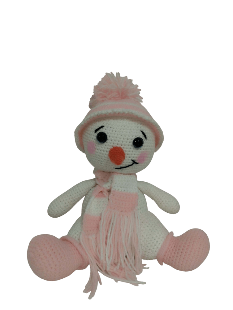Encantador muñeco de nieve tejido a mano con técnica amigurumi, elaborado con mimo en suaves tonos blanco y rosa pastel. Su carita tierna, con mejillas sonrojadas y nariz naranja, transmite alegría y ternura a primera vista. Luce un precioso gorrito con pompón y una bufanda a juego que le dan un toque invernal muy dulce y acogedor. Perfecto para decorar en Navidad, ambientar habitaciones infantiles o regalar como detalle especial y artesanal. Una pieza única de unos 30 cm lleno de encanto que aporta calidez y ternura en cualquier rincón. Perfecto para quienes aman los detalles hechos con cariño.